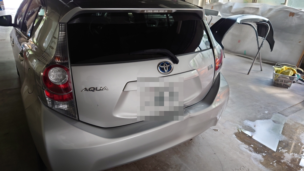 トヨタ アクア 保険修理 バックドア新品交換、リアバンパー新品交換、バックエンドパネル新品交換 傷へこみ鈑金塗装修理でお預かりしました。