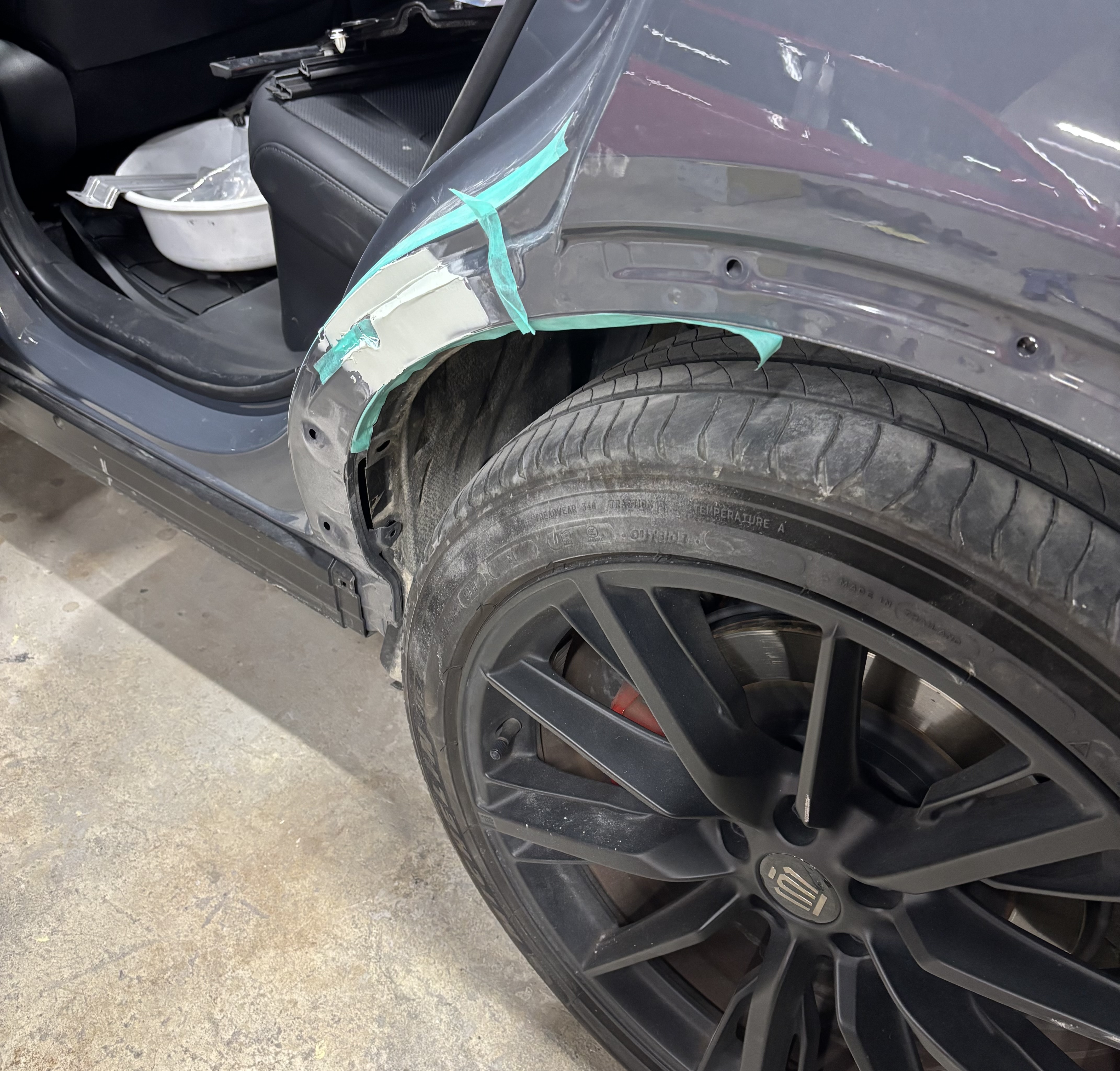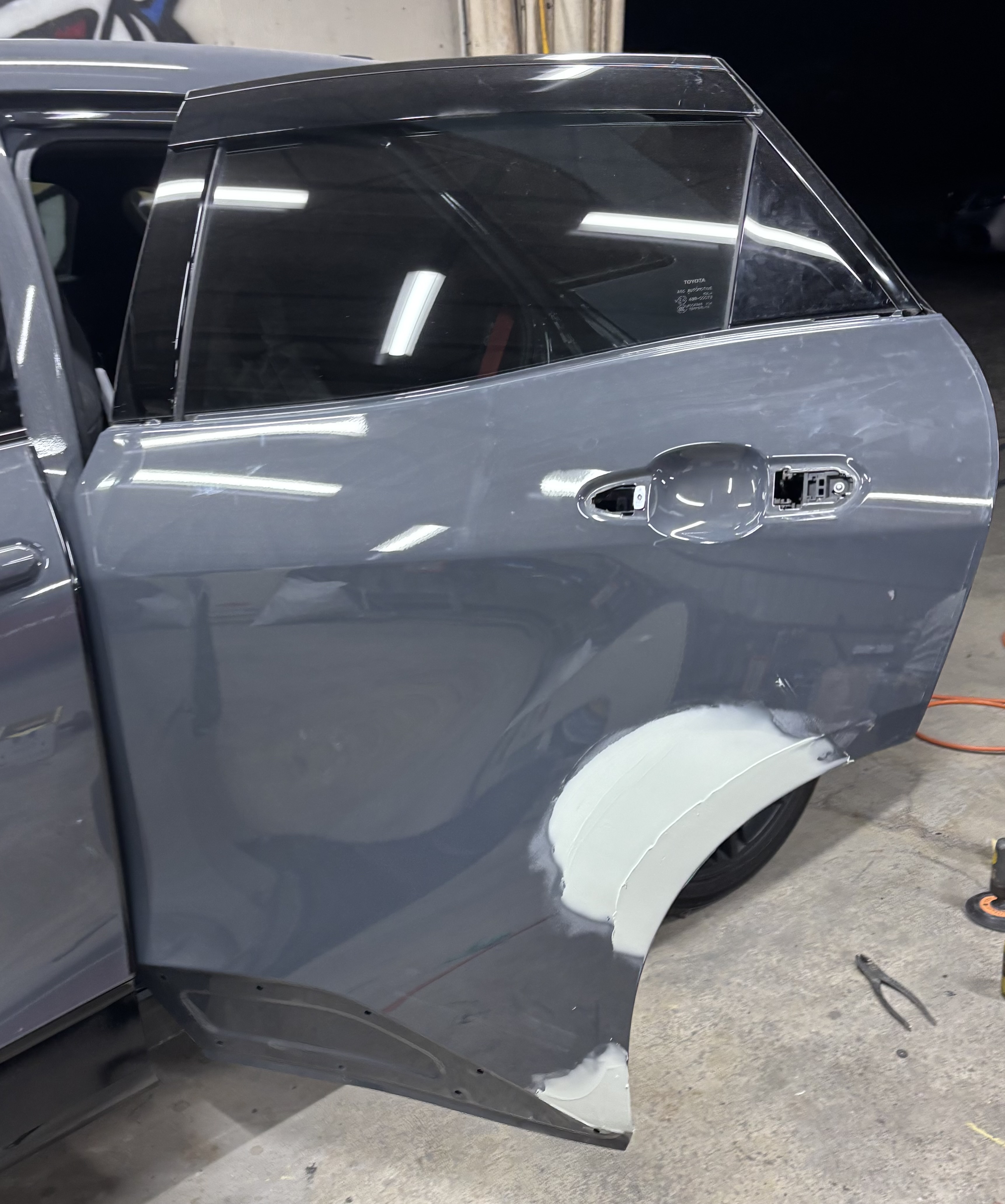 左リアドア板金・左クウォーターパネル板金・モール交換でお預かりしている。