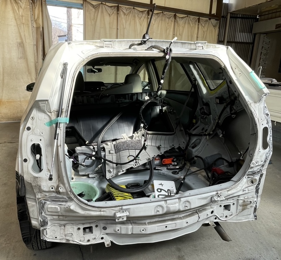 バックドア交換・エンドパネル交換・右テールランプサポート交換・テールランプ交換・クウォーターパネル板金、バンパー交換でお預かりしている。