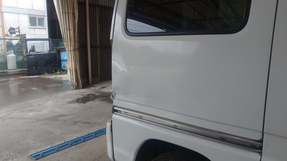 スバル サンバー 右リアクォーター傷へこみ鈑金塗装修理でお預かりしました。