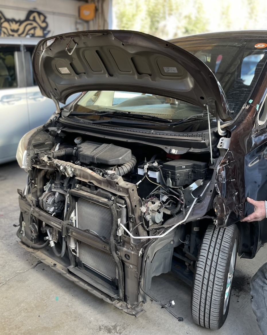 ボンネット・左フェンダー交換・バンパー交換、左アルミホイール交換・左ヘッドライトサポート板金、右フロントフェンダー板金、左フロントドア交換、ブラケット交換でお預かりいたしました。