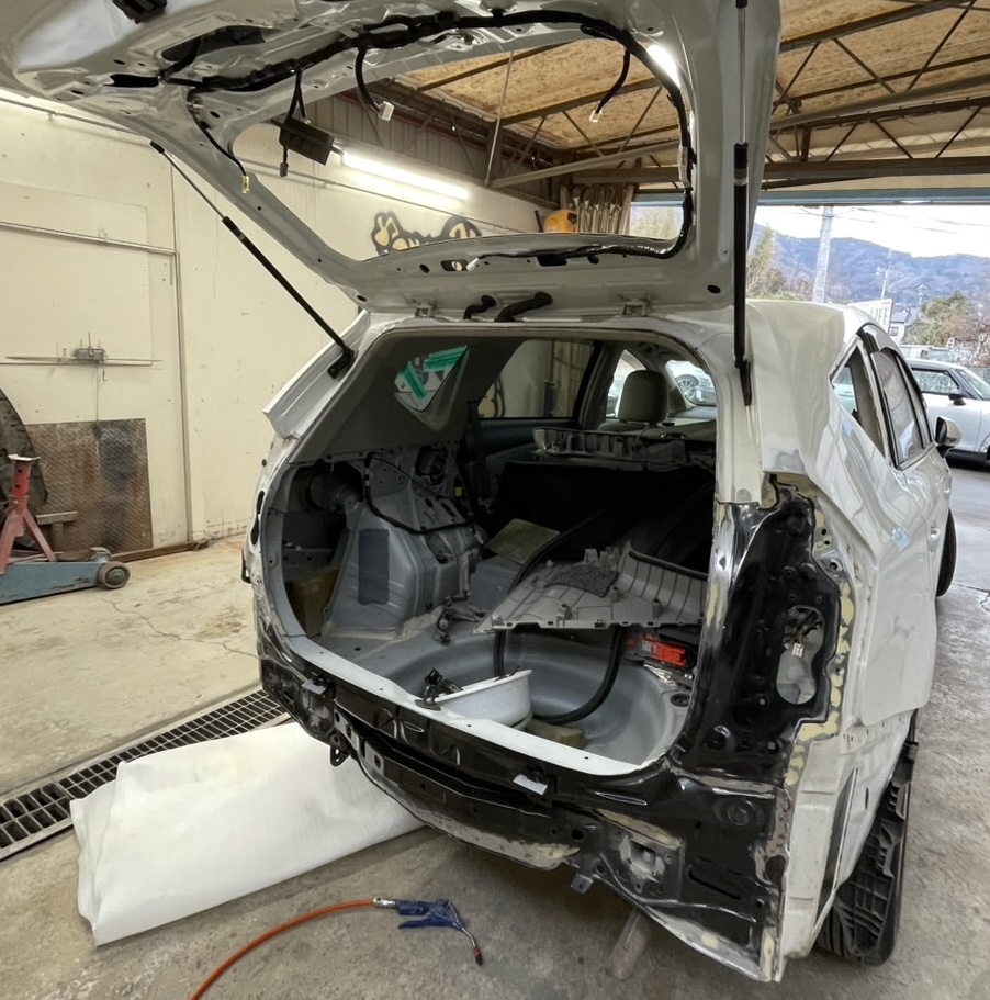 バックドア交換・エンドパネル交換・右テールランプサポート交換・テールランプ交換・クウォーターパネル板金、バンパー交換でお預かりしている。