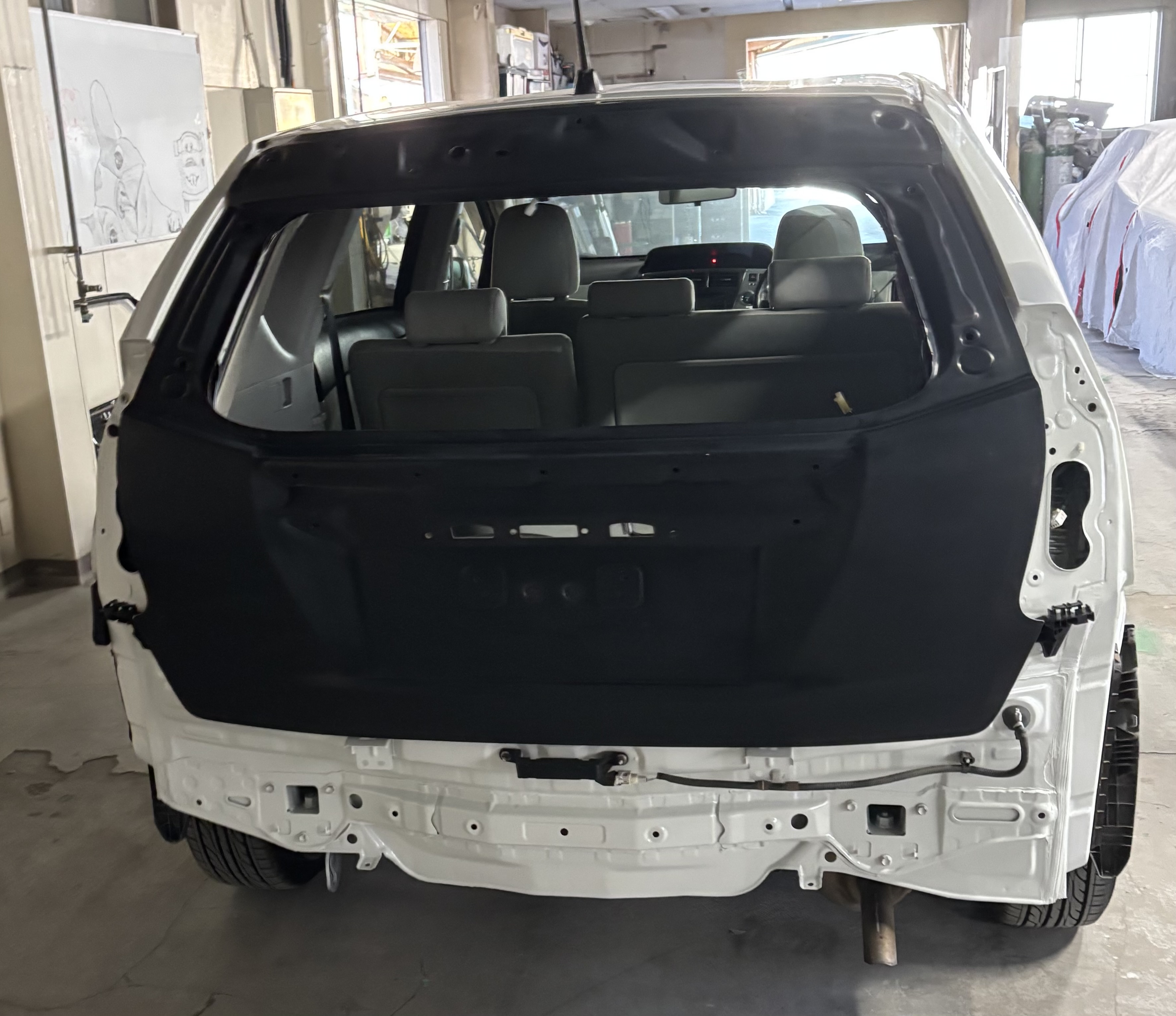 バックドア交換・エンドパネル交換・右テールランプサポート交換・テールランプ交換・クウォーターパネル板金、バンパー交換でお預かりしている。